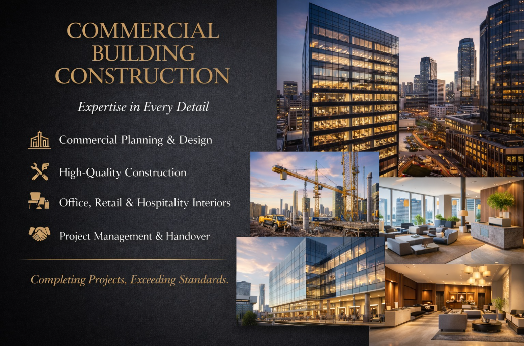 Professional commercial building construction focused on functional layouts, modern architecture, durable materials, and efficient project completion.