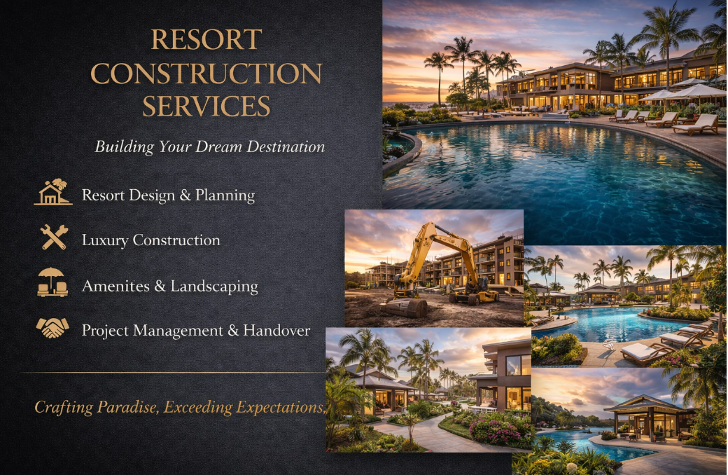 Premium resort construction combining luxury design, natural surroundings, durable materials, and comfortable spaces for unforgettable guest experiences.