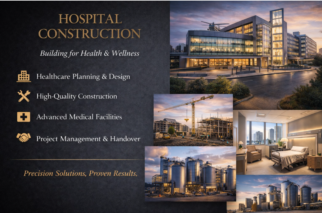 Specialized hospital construction ensuring functional layouts, safety standards, advanced infrastructure, and patient-friendly medical environments.